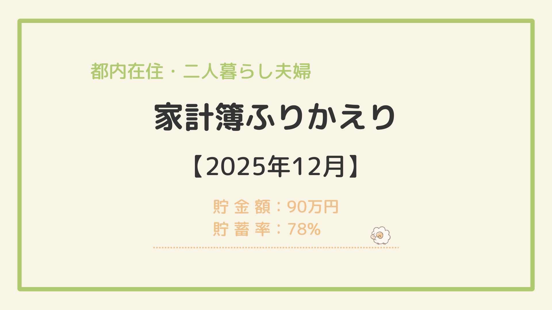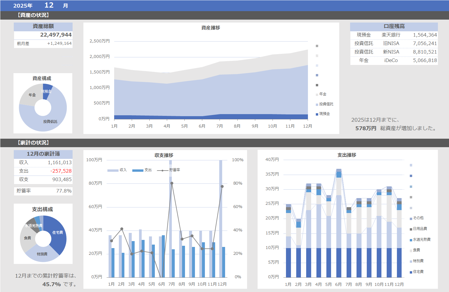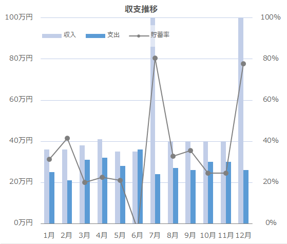 この金額には、投資による資産の増減は含んでいません。12月は、夫婦ともに賞与が支給されて収入が100万円超え。貯蓄率は77.8%でした。